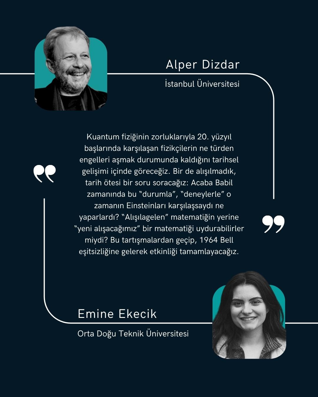 Kuantumun meşhur olasılıkçı yapısını, tarihsel gelişim süreciyle ve ezber bozan bir bakış açısıyla ele alıyoruz. Bir hafta boyunca 1964 Bell Eşitsizliği’ne kadar bilim insanlarının kuantum fiziğiyle nasıl ilişkilendiğini masaya yatıracağız ve kuantum fiziğine dair bugünkü tartışmaların temellerini ortaya sereceğiz. Alper Dizdar ve Emine Ekecik yürütücülüğünde gerçekleşecek bir haftalık programa davetlisiniz.