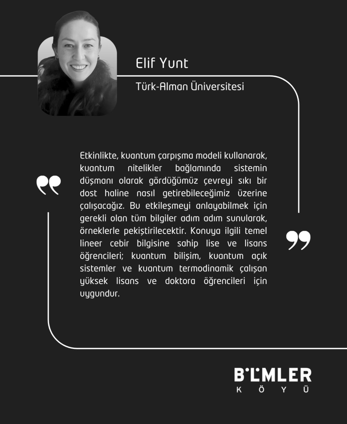 Elif Yunt’un yürütücülüğünde gerçekleşecek olan bu etkinlikte, kuantum fiziğinin en merak uyandırıcı alanlarından biri olan açık sistemleri sezgisel bir perspektifle derinlemesine inceliyoruz. Kuantum dünyasının karmaşık yapısını ve çevreyle olan etkileşimini keşfetmek isteyen herkesi bir araya getirecek bu kapsamlı programın detayları ve kayıt işlemleri için: https://bilimler.org/etkinlikler/fizik/177/
