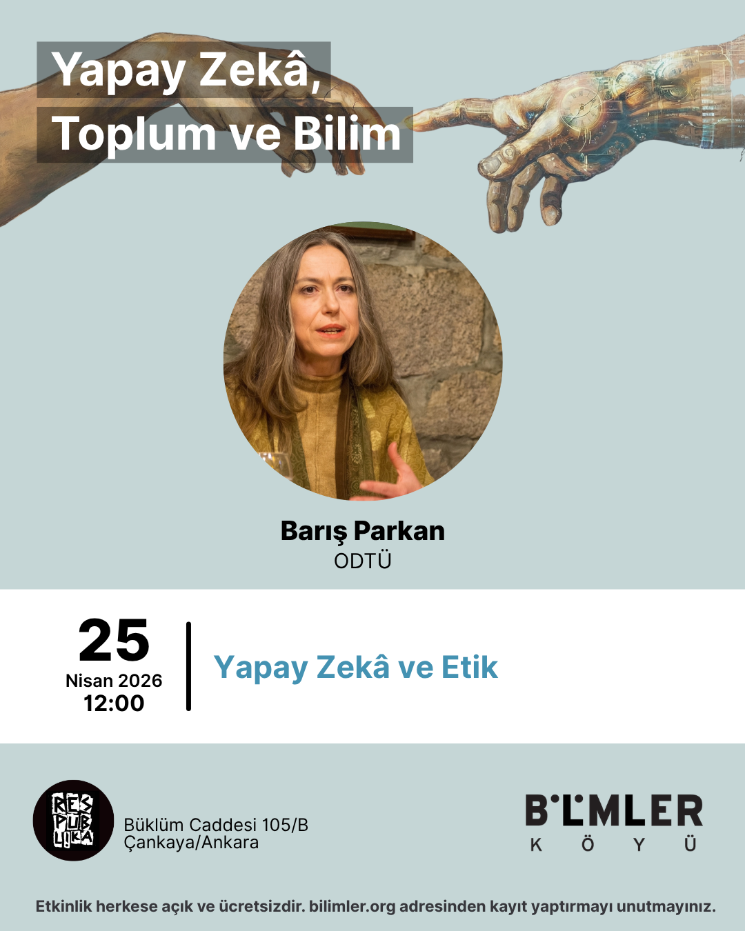 Bilimler Köyü Ankara'nın “Yapay Zekâ, Toplum ve Bilim” dizisinde bu bahar, yapay zekâyı tarihsel, teknik ve toplumsal boyutlarıyla birlikte tartışıyoruz. Sizleri ekonomi politiğinden büyük dil modellerine, enerji-çevre ilişkilerinden eşitsizliklere, sanat/edebiyattan etik tartışmalara uzanan oturumlara davet ediyoruz.