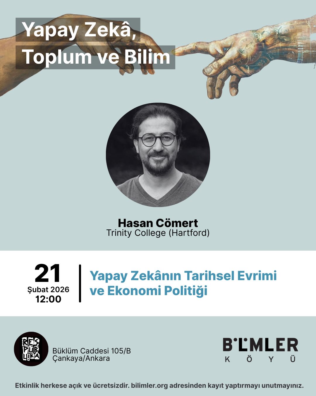 Bilimler Köyü Ankara etkinlikleri kapsamında düzenlediğimiz "Yapay Zekâ, Toplum ve Bilim" üst başlıklı ders dizisinin ilk oturumu olan "Yapay Zekânın Tarihi, Evrimi ve Ekonomi Politiği" Hasan Cömert hocamızın anlatımıyla gerçekleşecek.